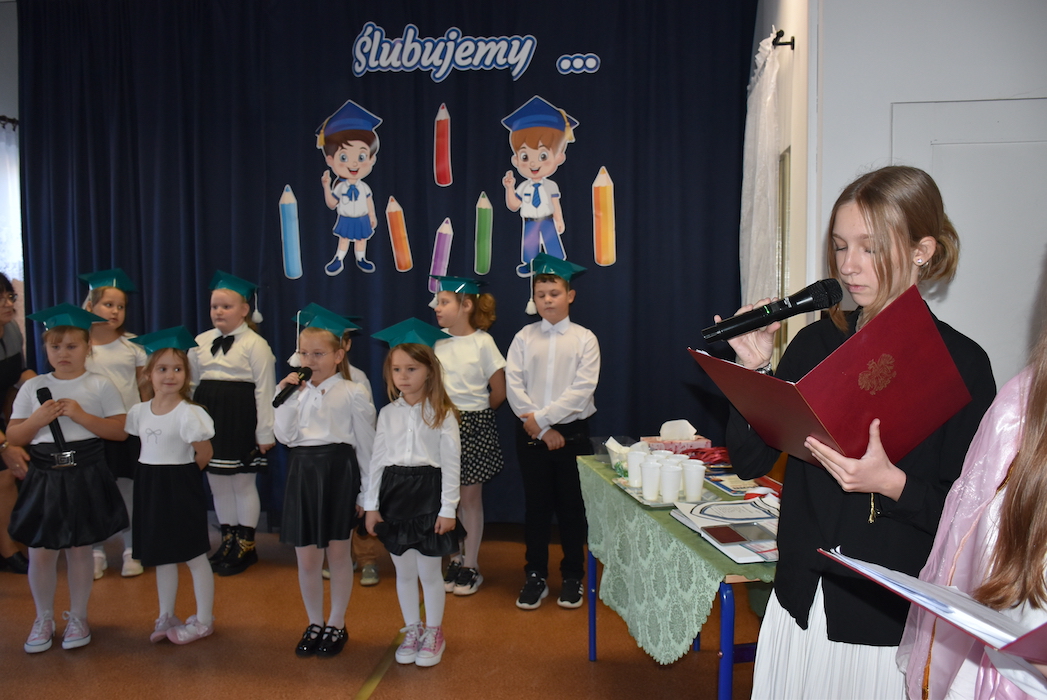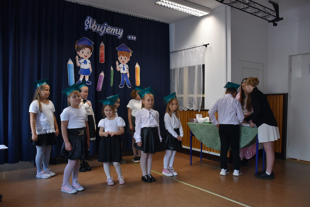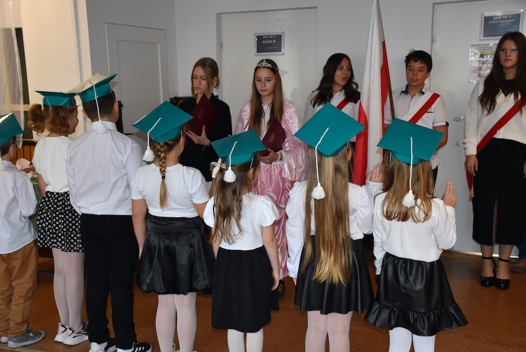 13 października odbyło się w naszej szkole pasowanie na ucznia klasy pierwszej. Pierwszoklasistów w poczet braci uczniowskiej wprowadziły przewodnicząca i w-ce przewodnicząca Samorządu Uczniowskiego naszej szkoły. Pierwszaki zanim przystąpili do ślubowania, musieli zaliczyć mini egzamin, przeprowadzony przez starsze koleżanki, który obejmował m.in. test na patriotę, test sprawnościowy czy recytatorski. Nasi pierwszoklasiści zdali je wszystkie! Po ślubowaniu na flagę państwową otrzymali dyplomy i medale od pana Dyrektora.