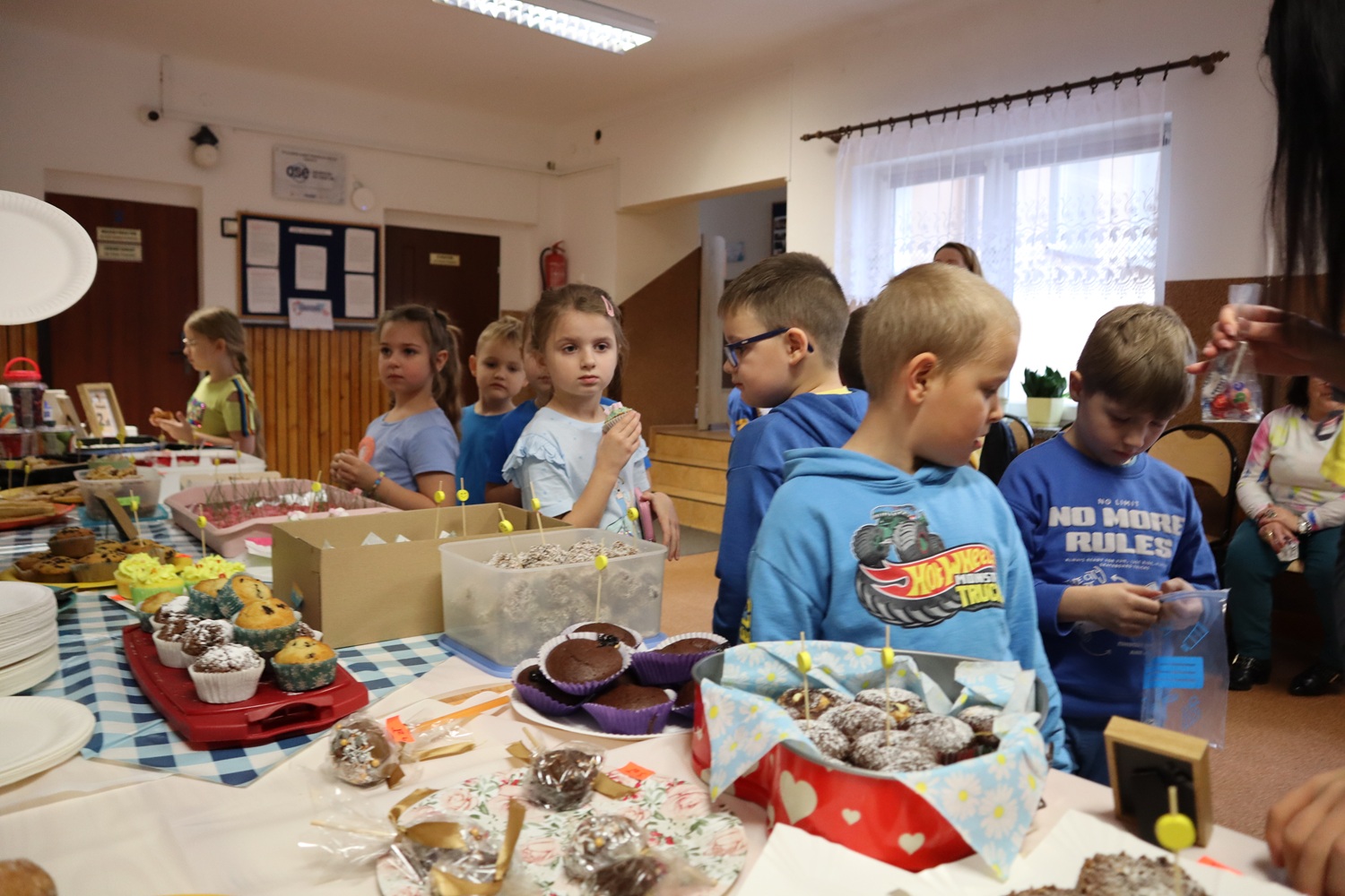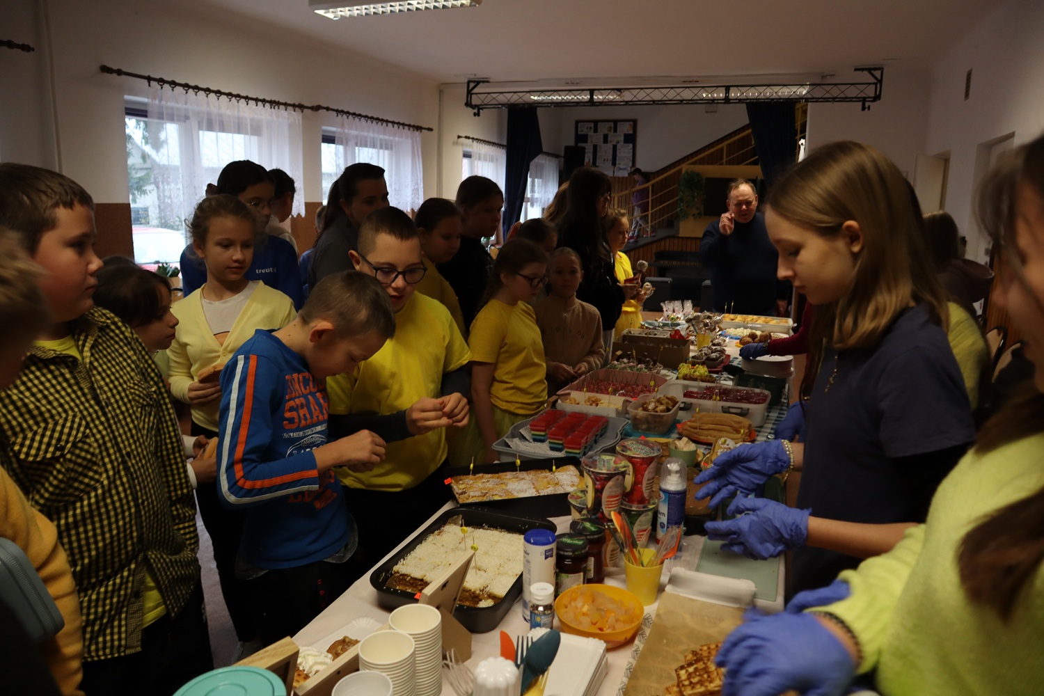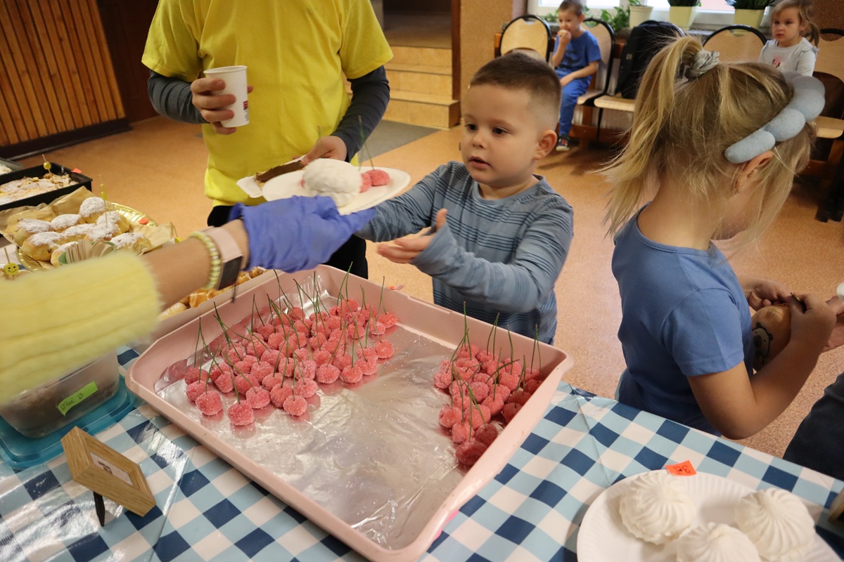 Jednym z głównych punktów dnia był kiermasz słodkości, który cieszył się ogromnym zainteresowaniem. Rodzice naszych uczniów wykazali się niezwykłym zaangażowaniem – przygotowali przepyszne ciasta, babeczki, ciasteczka i różnorodne słodkości, które znikały w błyskawicznym tempie. Dzięki ich wsparciu kiermasz był nie tylko wyjątkowo smaczny, ale także pełen rodzinnej życzliwości i wspólnego działania.