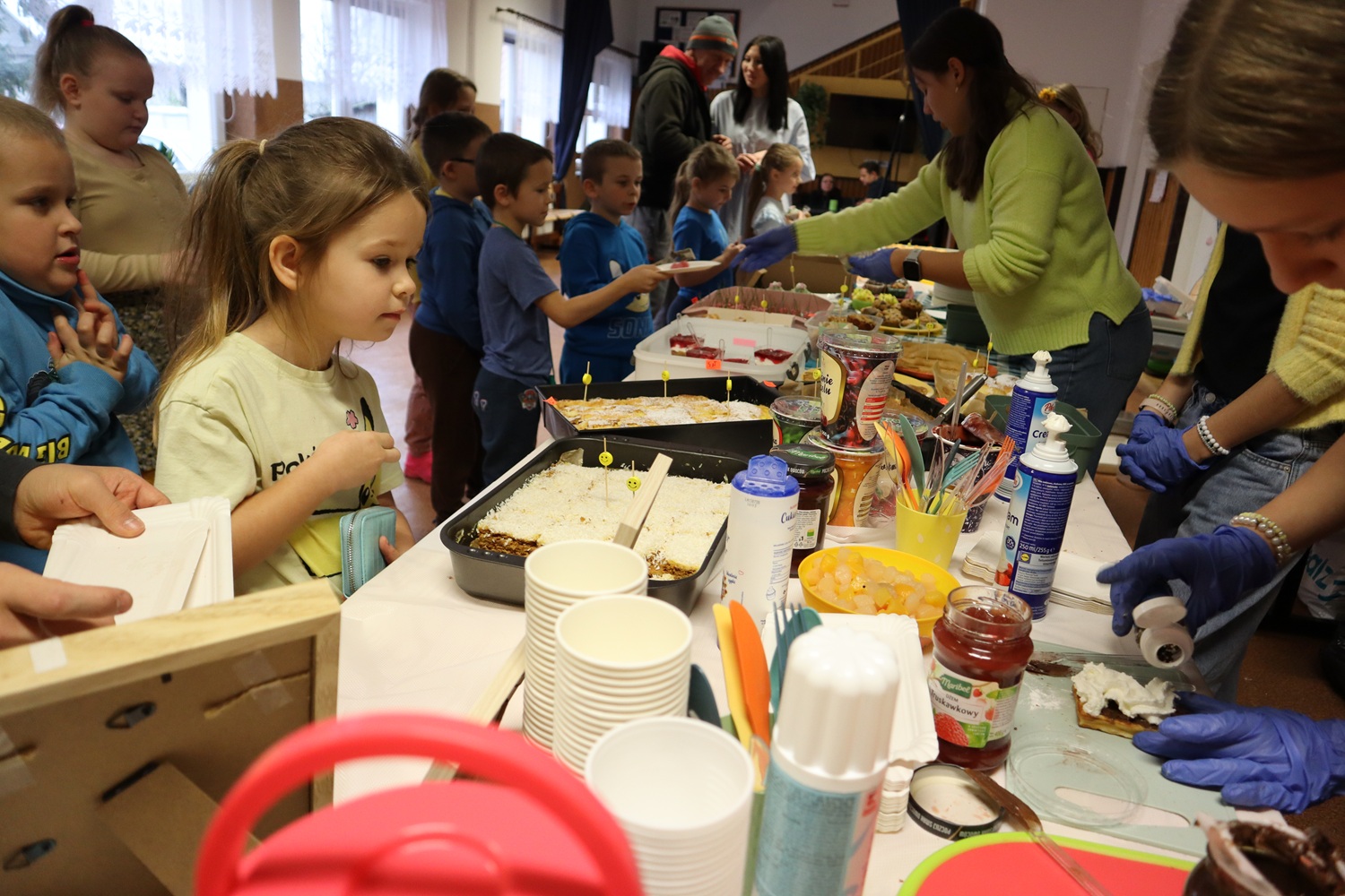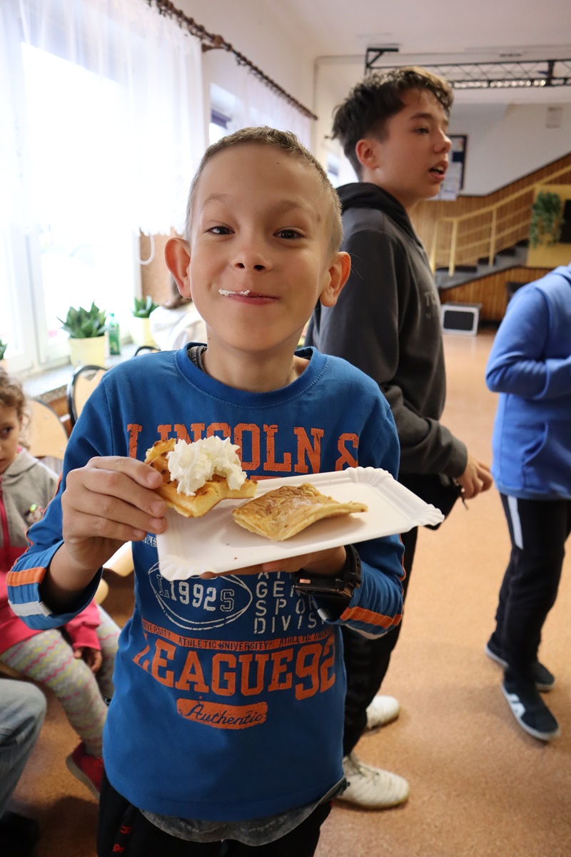 Ogromnym powodzeniem cieszyły się również gofry przygotowywane na miejscu przez uczennice SU. Przygotowywane na bieżąco, z różnorodnymi dodatkami do wyboru – dżemami, kremem czekoladowym, bitą śmietaną i innymi smakołykami – przyciągały długie kolejki od samego rana.