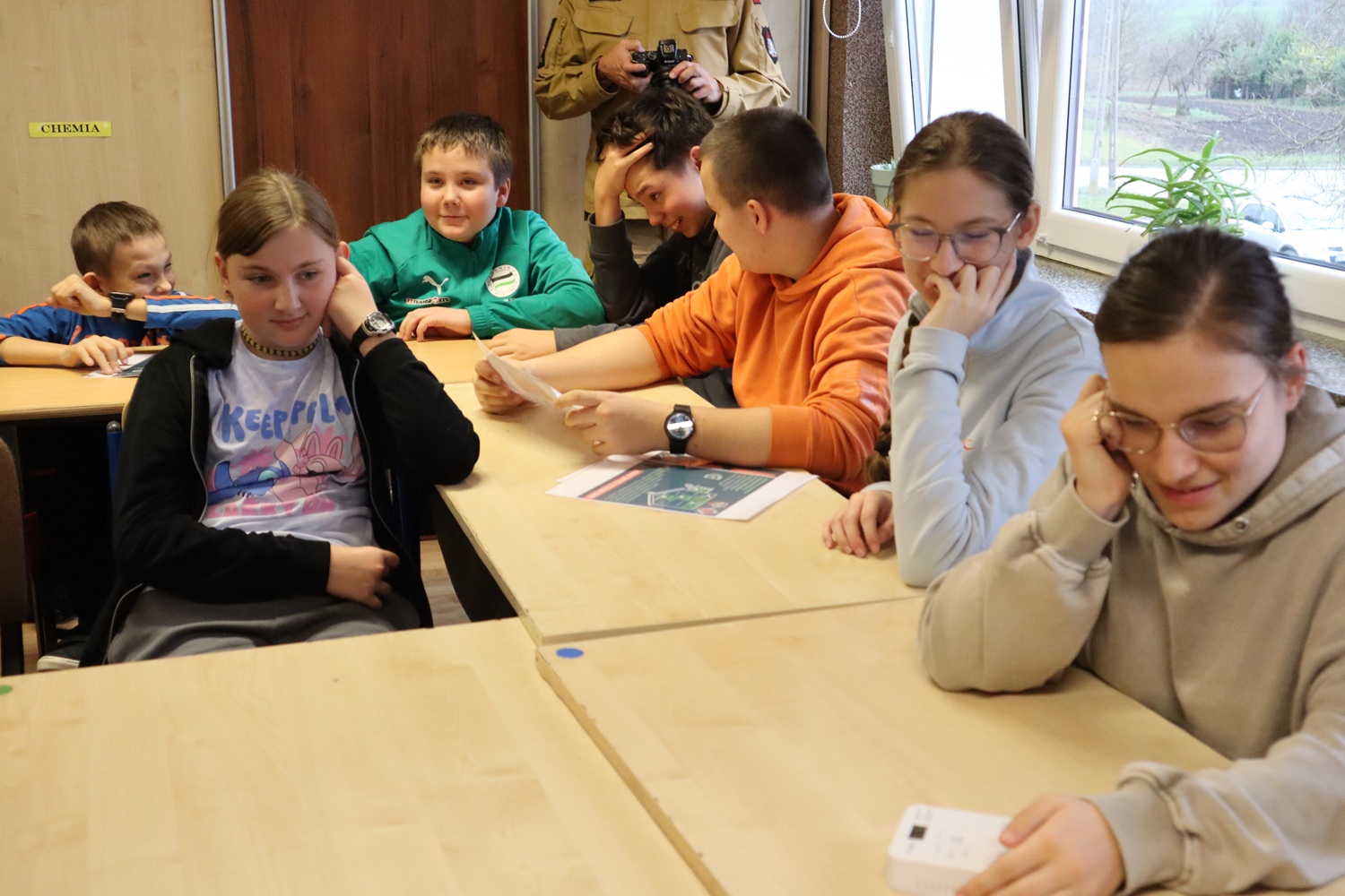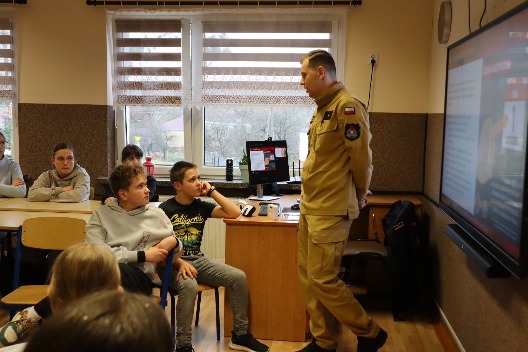 W miniony piątek uczniowie klas 4–8 uczestniczyli w spotkaniu edukacyjnym prowadzonym przez strażaków z Komendy Powiatowej Państwowej Straży Pożarnej