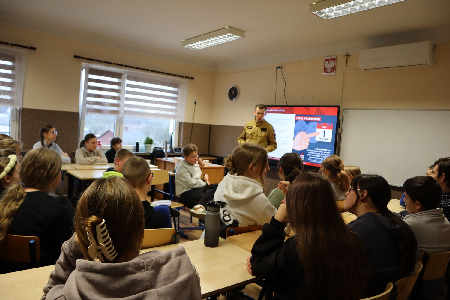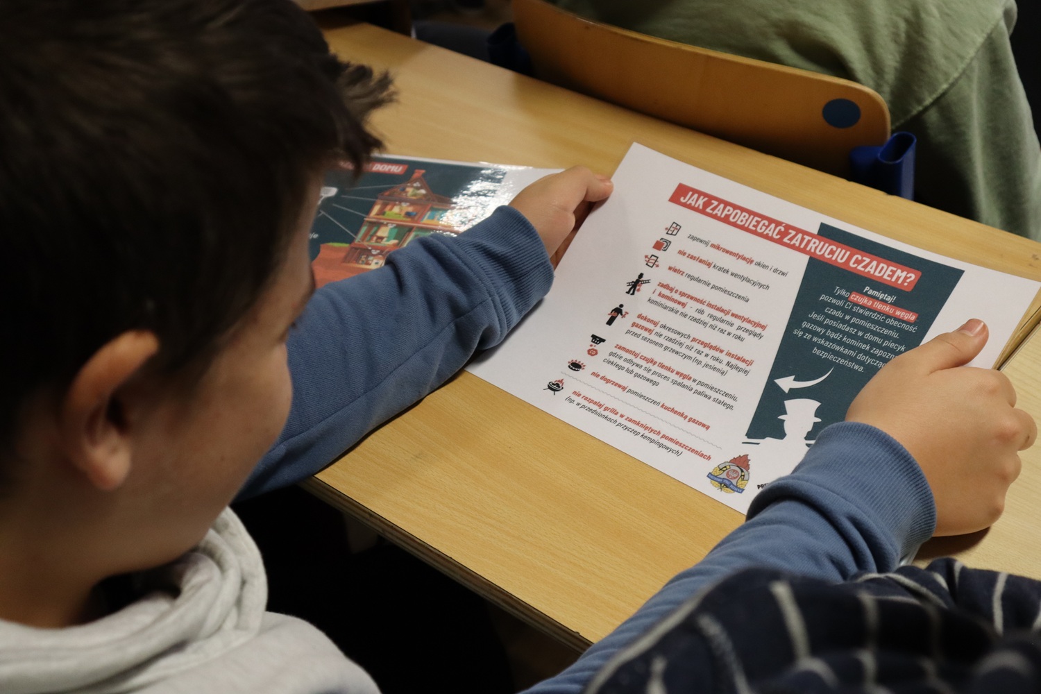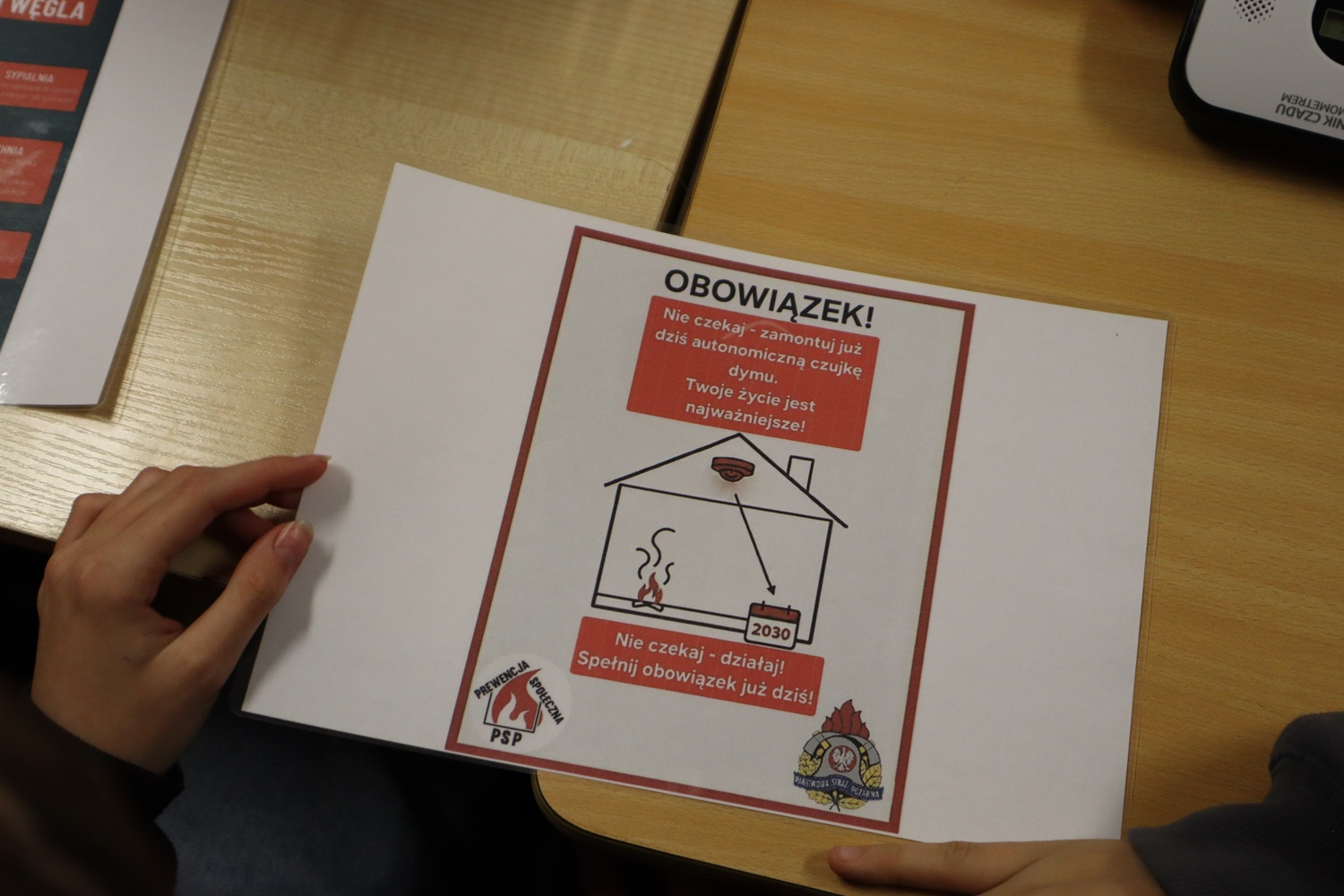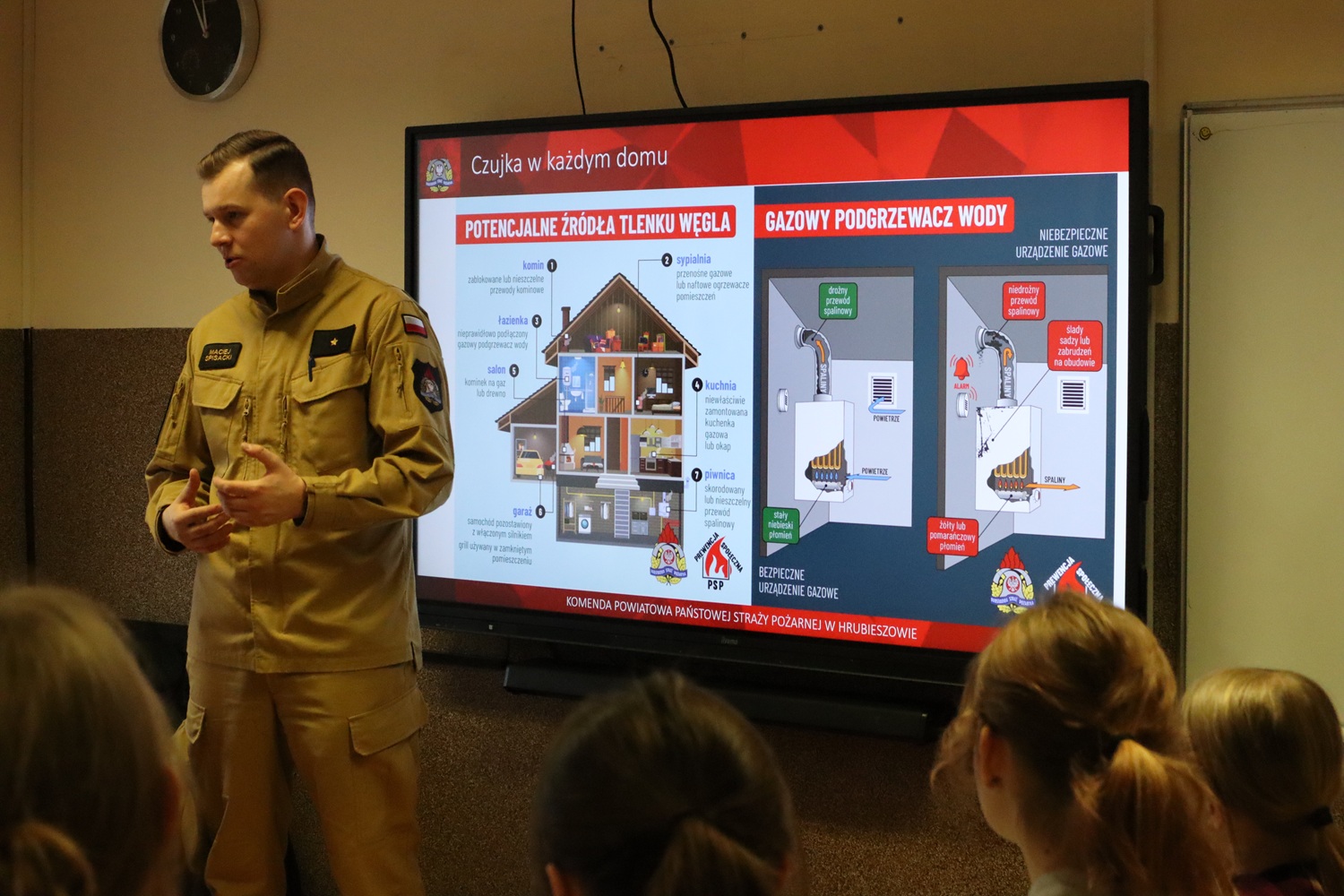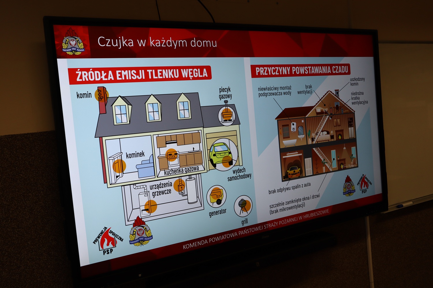 w Hrubieszowie. Podczas zajęć młodzież dowiedziała się, jak działają czujniki dymu i tlenku węgla oraz jakie zasady należy stosować, aby odpowiednio reagować
