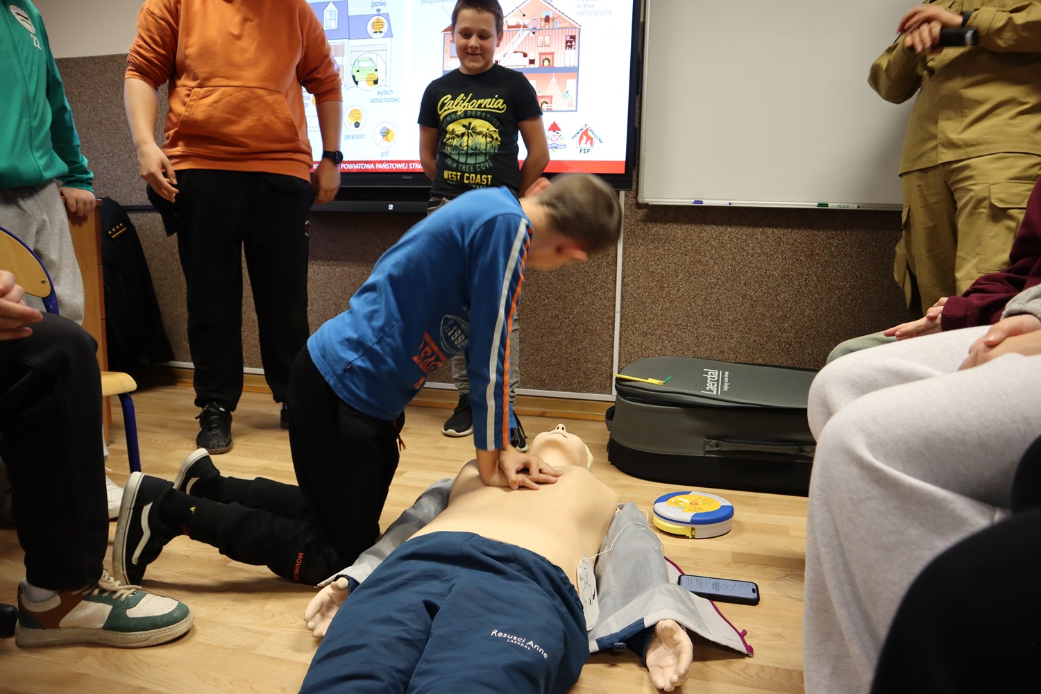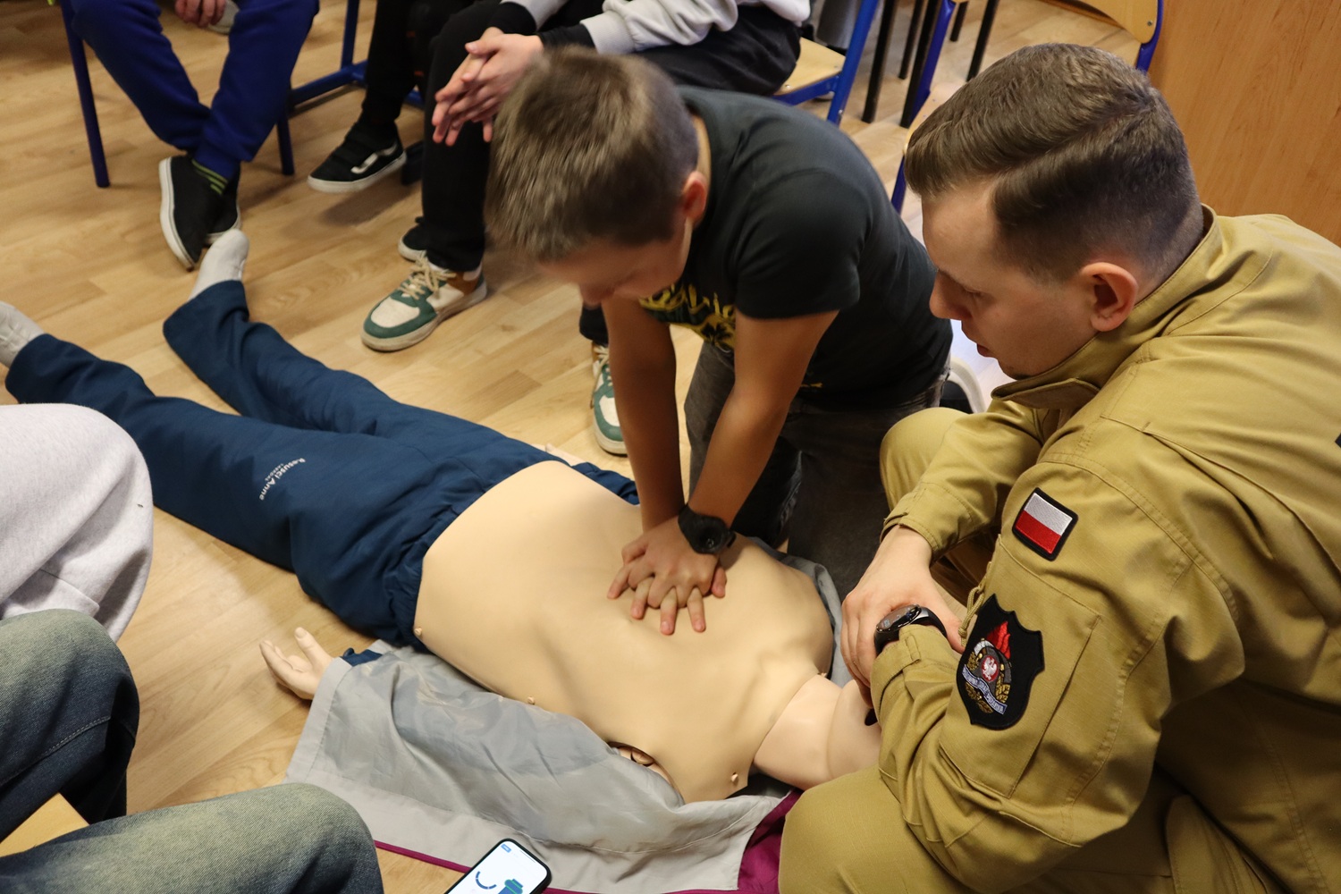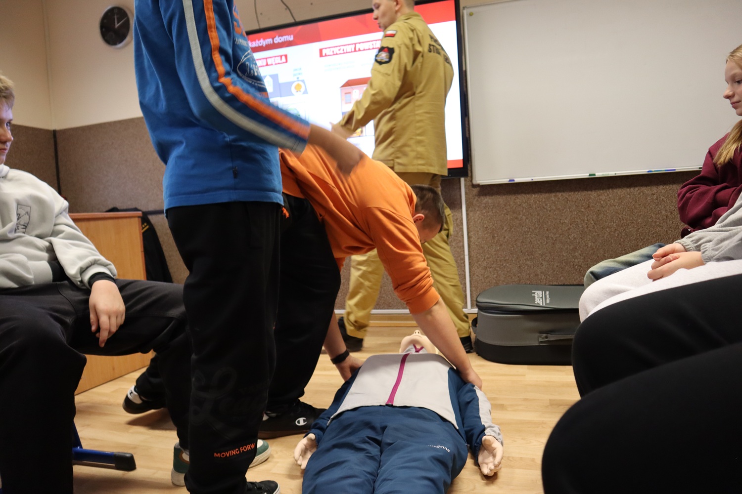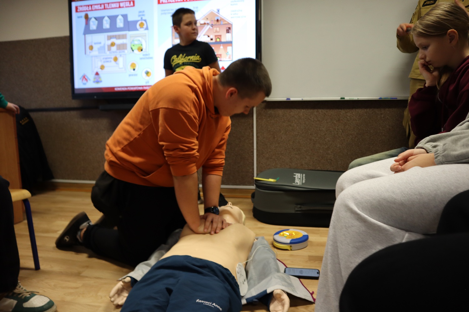 Spotkanie wzbogaciła również praktyczna część poświęcona pierwszej pomocy. Uczniowie przypomnieli sobie schemat wzywania służb ratunkowych, nauczyli się oceny stanu poszkodowanego i mogli przećwiczyć podstawowe czynności ratownicze na manekinie.