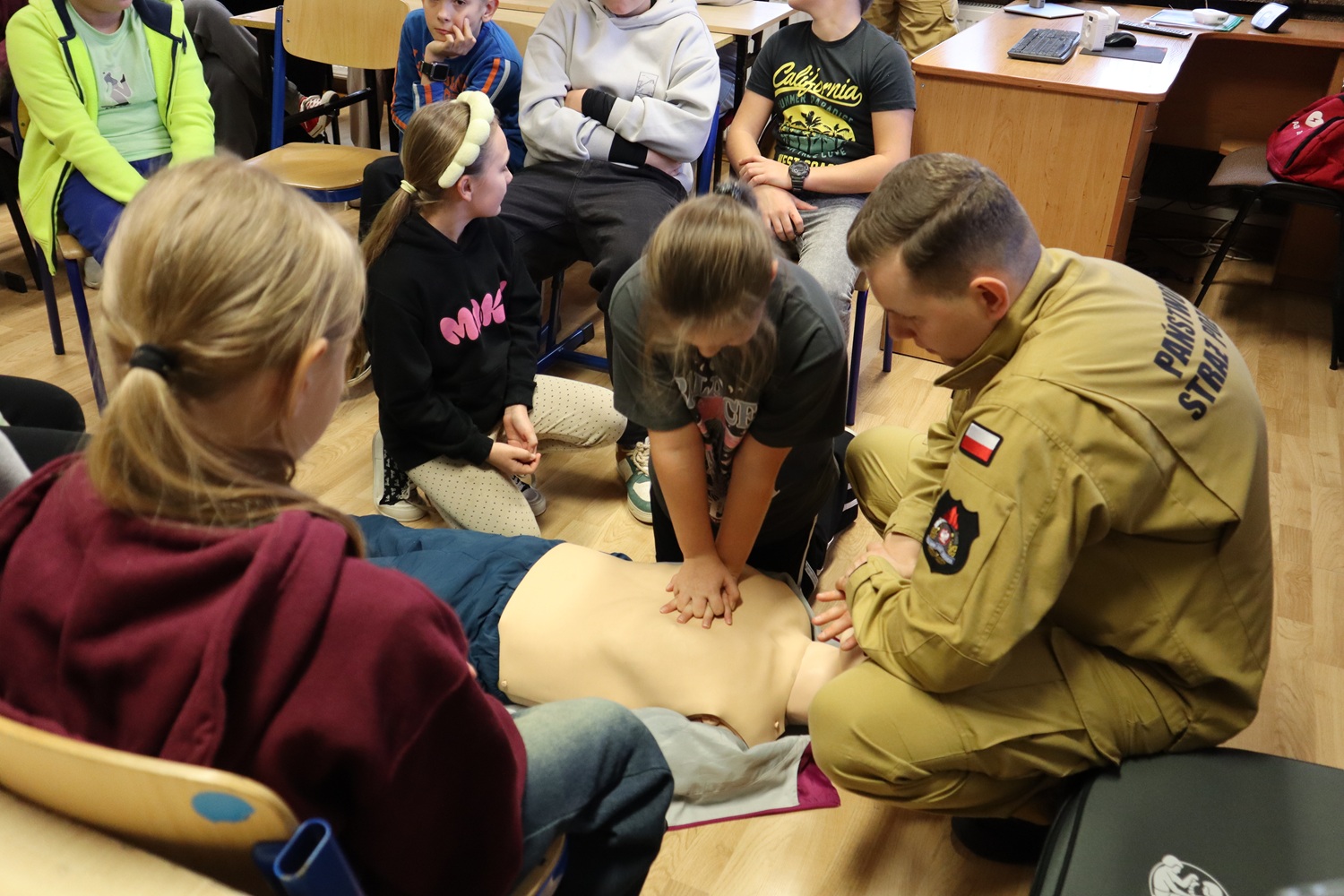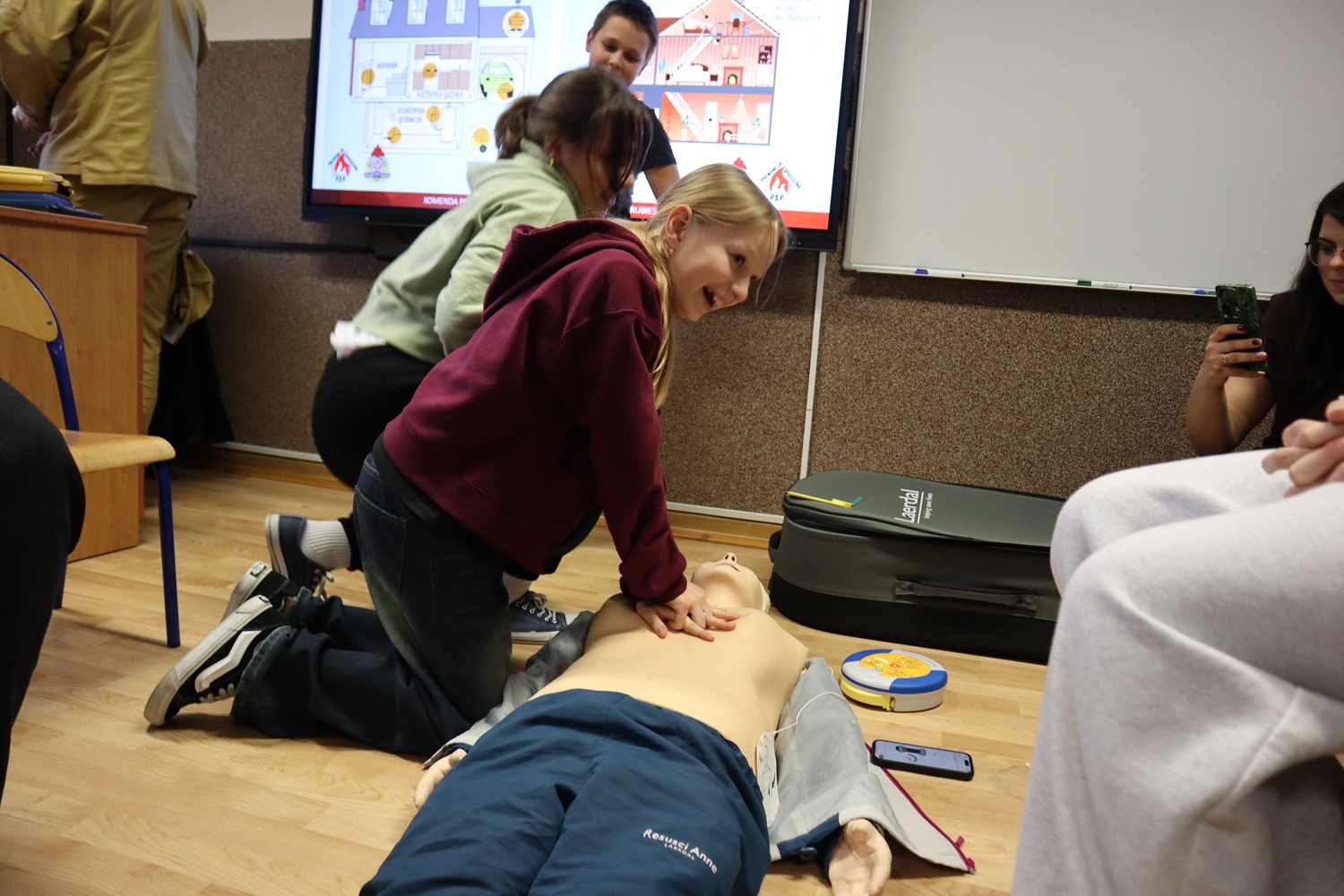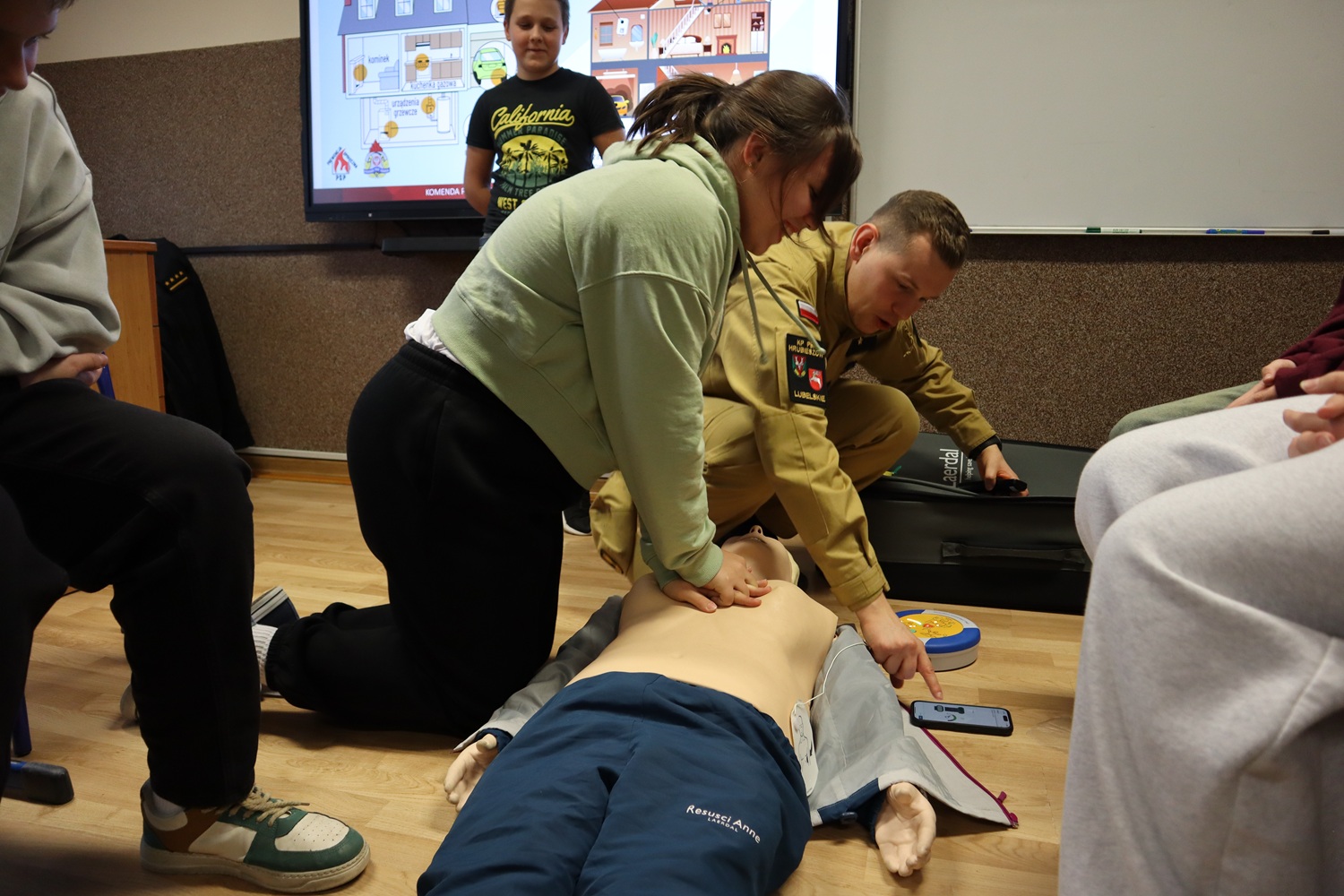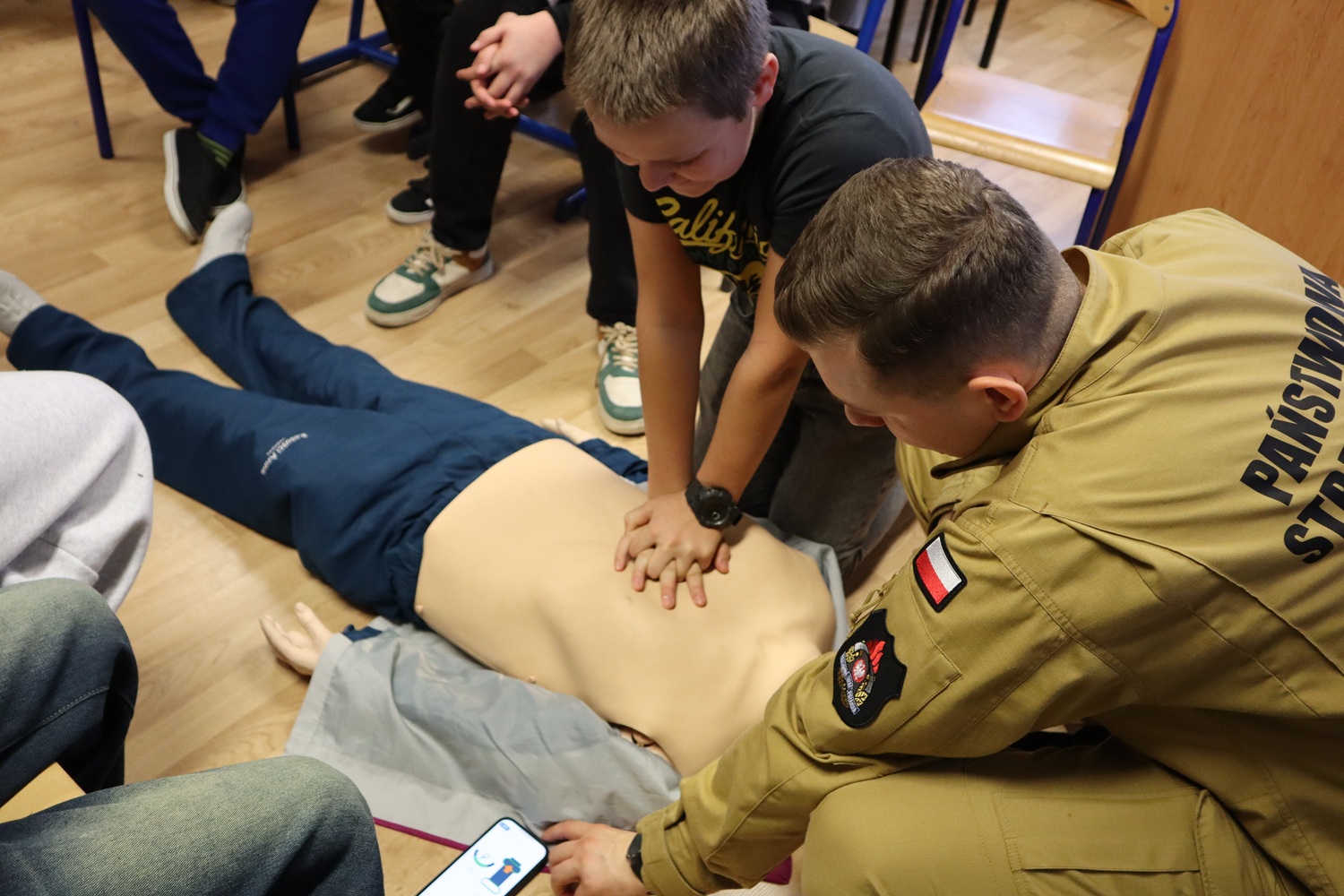 Spotkanie wzbogaciła również praktyczna część poświęcona pierwszej pomocy. Uczniowie przypomnieli sobie schemat wzywania służb ratunkowych, nauczyli się oceny stanu poszkodowanego i mogli przećwiczyć podstawowe czynności ratownicze na manekinie.