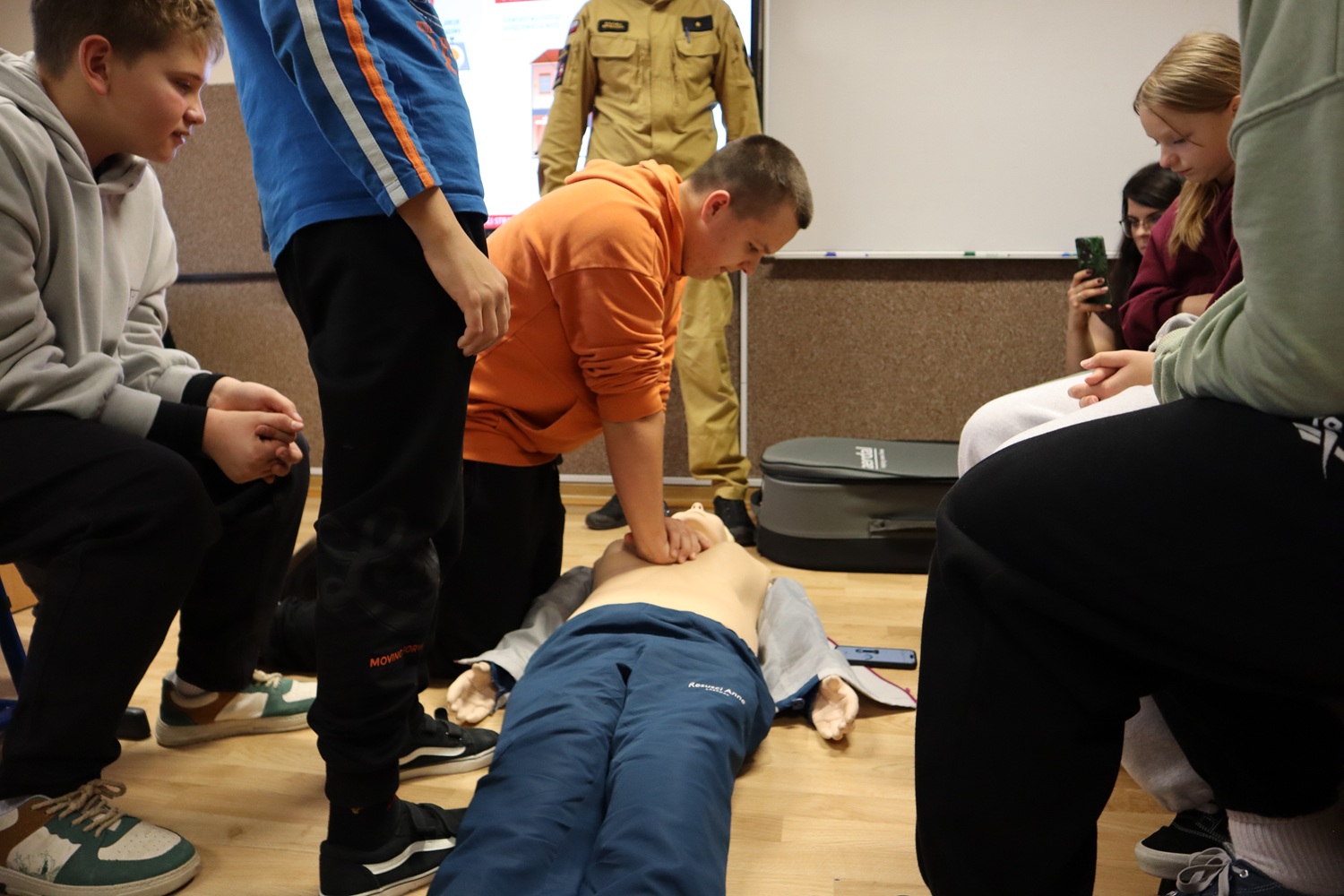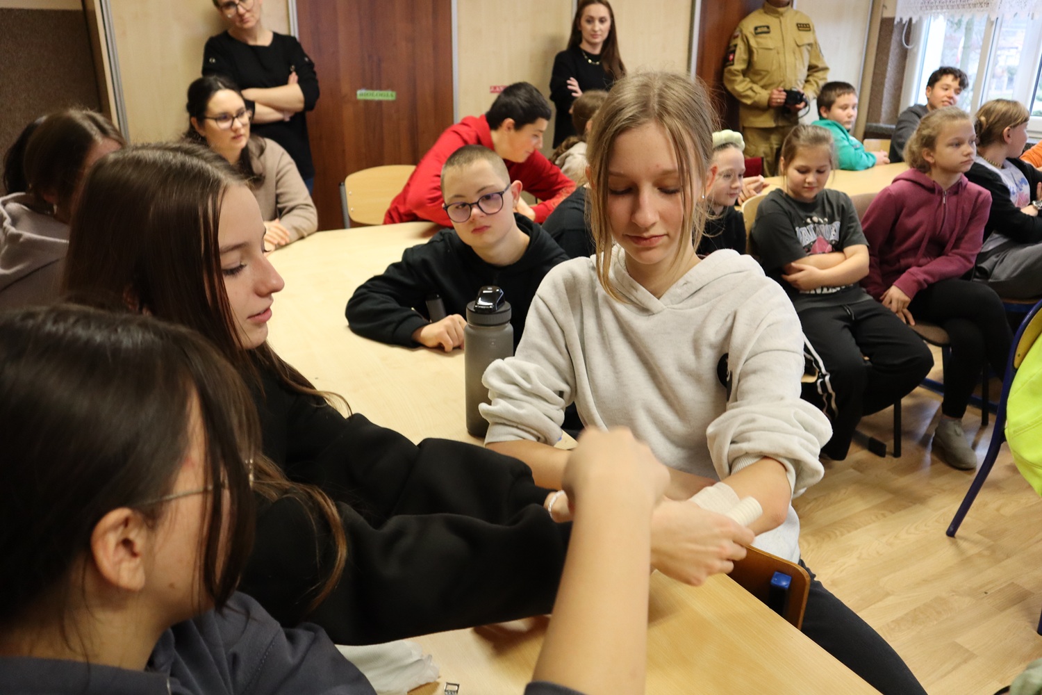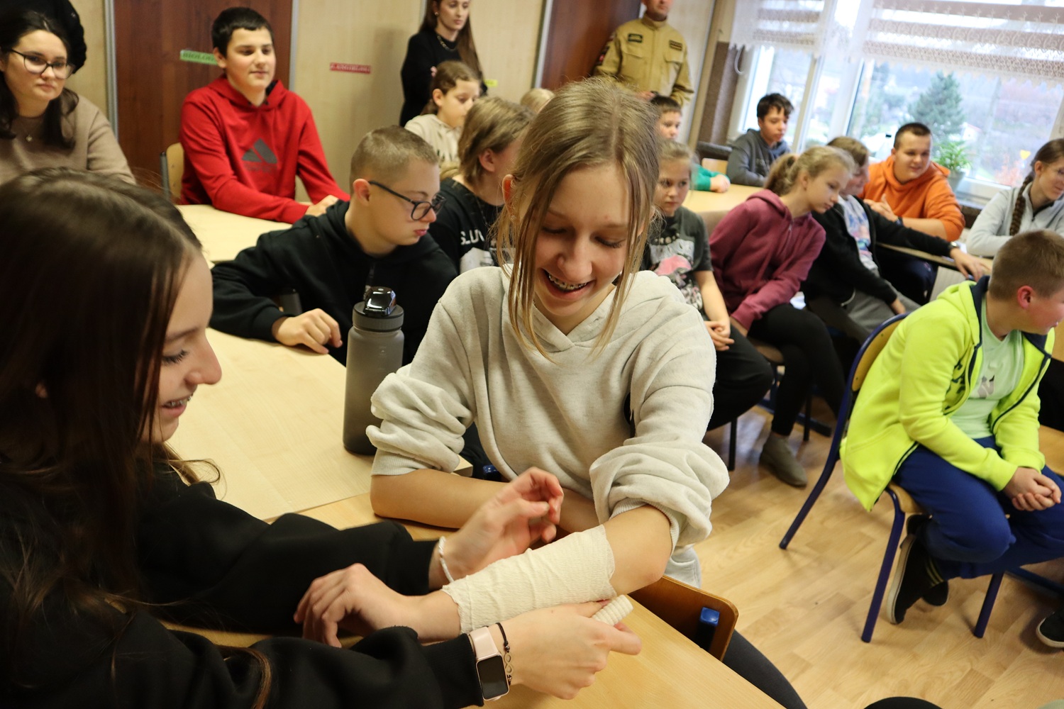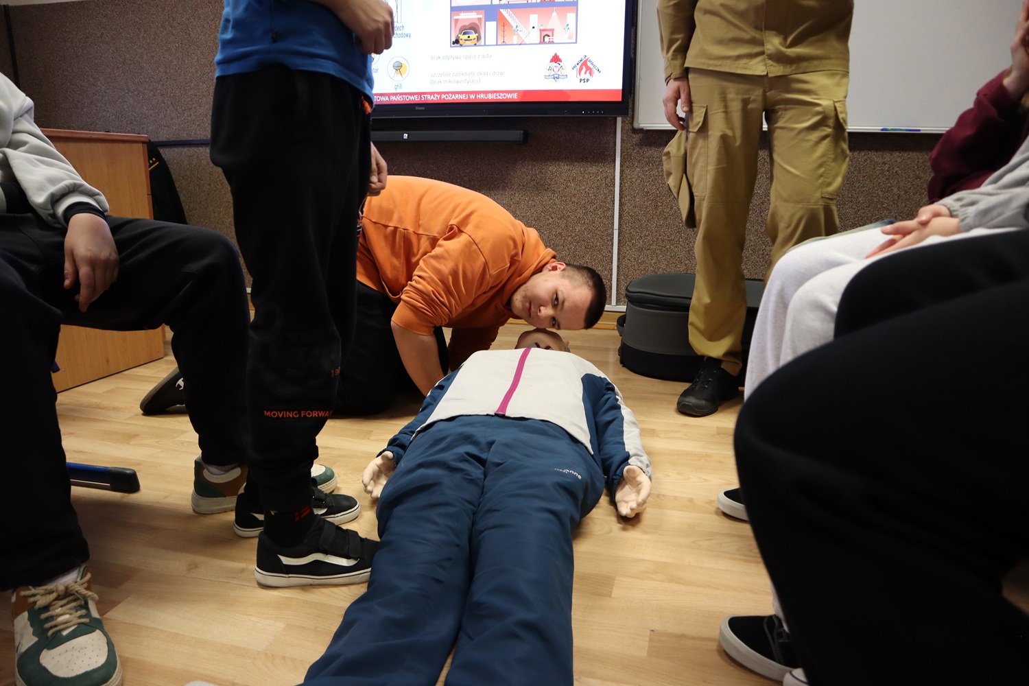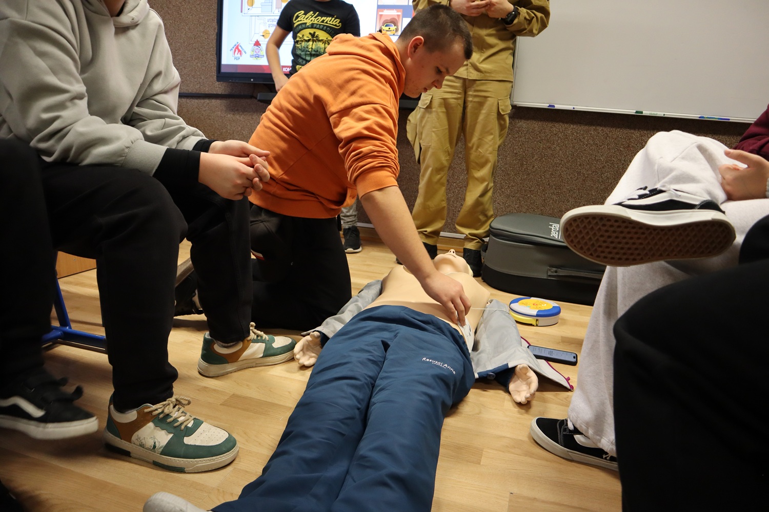 Spotkanie wzbogaciła również praktyczna część poświęcona pierwszej pomocy. Uczniowie przypomnieli sobie schemat wzywania służb ratunkowych, nauczyli się oceny stanu poszkodowanego i mogli przećwiczyć podstawowe czynności ratownicze na manekinie.