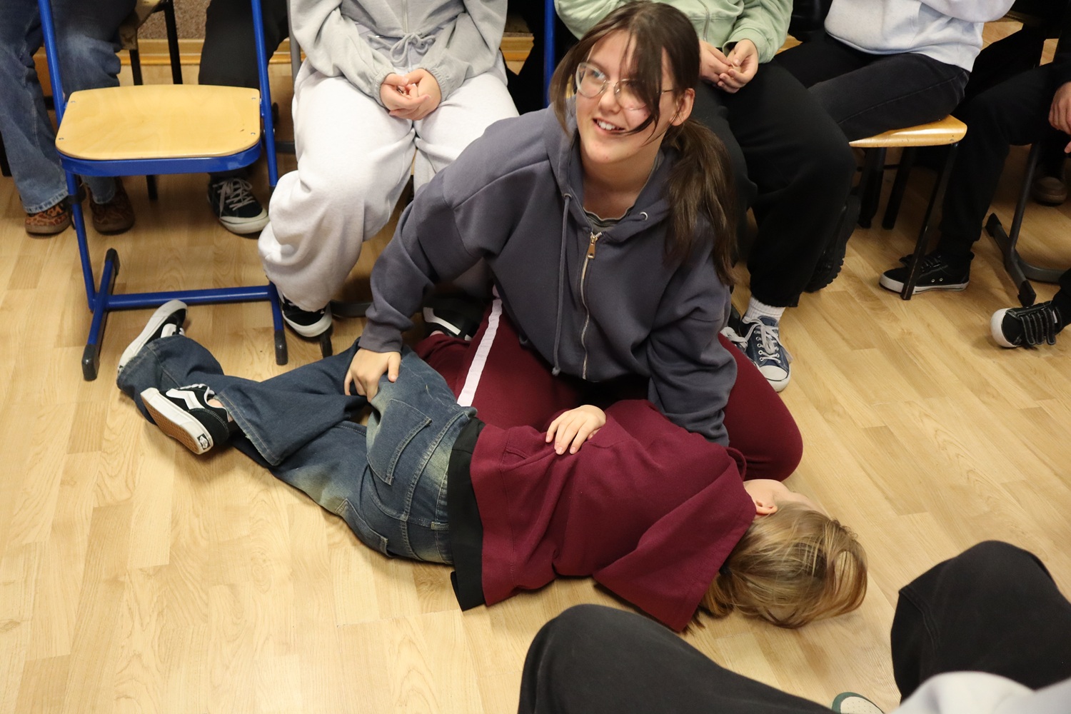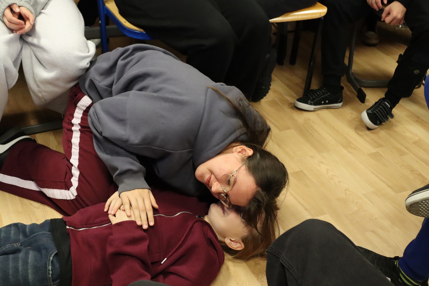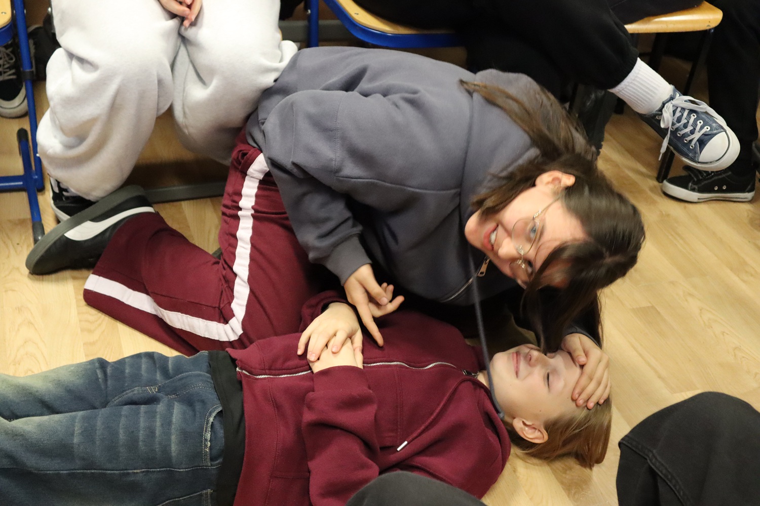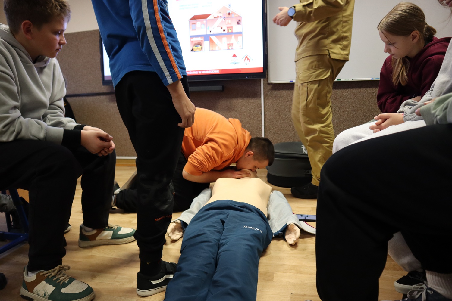 Spotkanie wzbogaciła również praktyczna część poświęcona pierwszej pomocy. Uczniowie przypomnieli sobie schemat wzywania służb ratunkowych, nauczyli się oceny stanu poszkodowanego i mogli przećwiczyć podstawowe czynności ratownicze na manekinie.