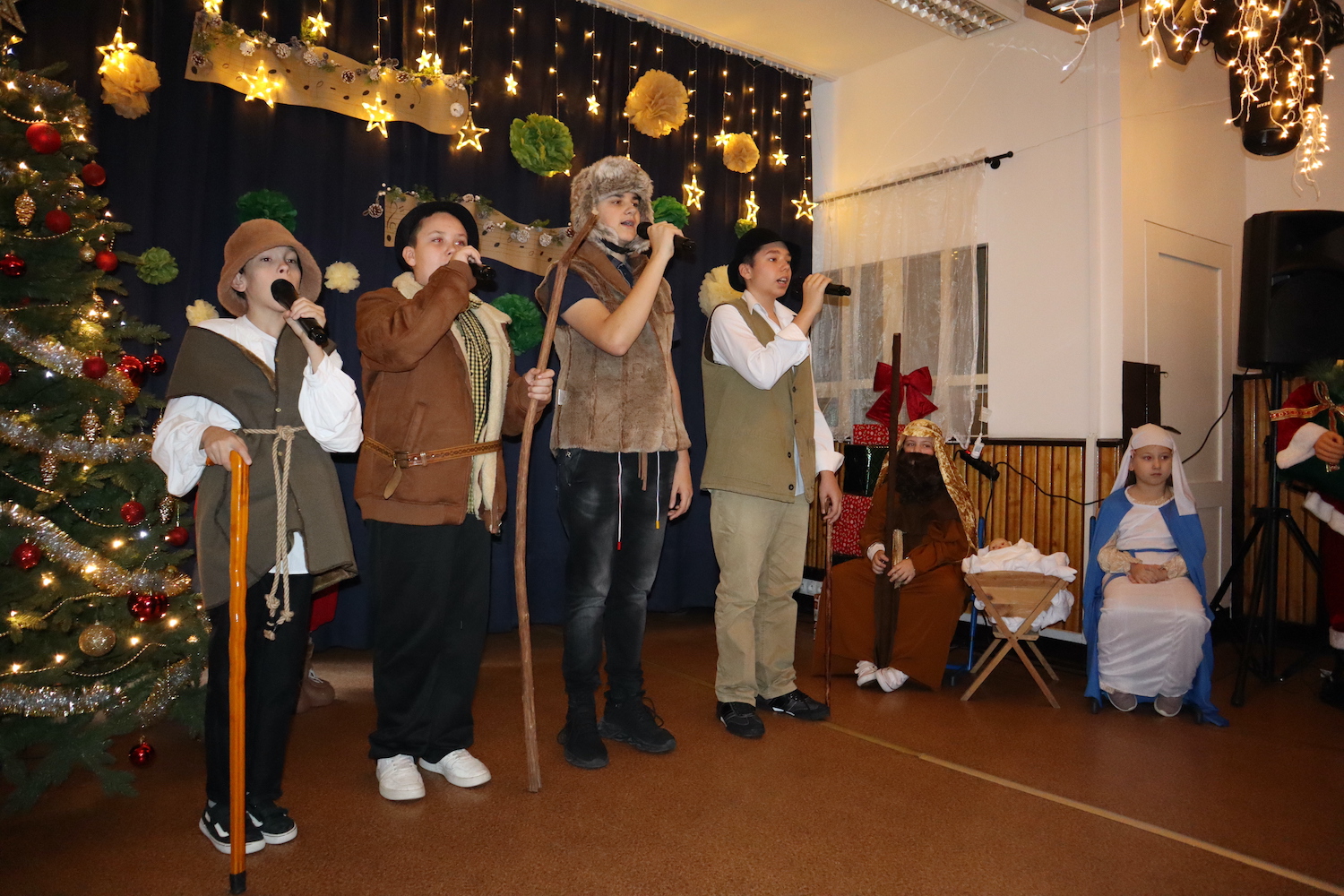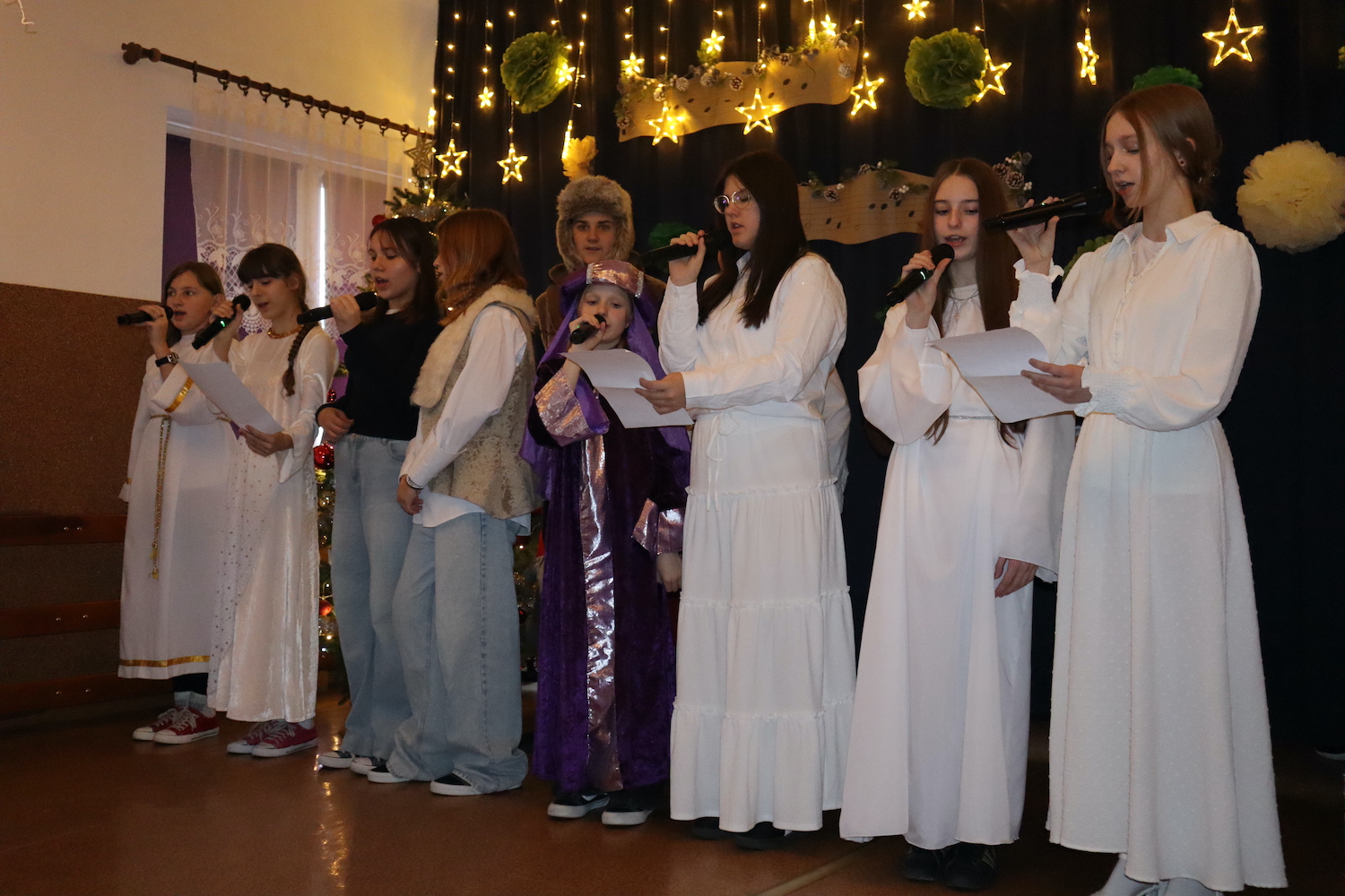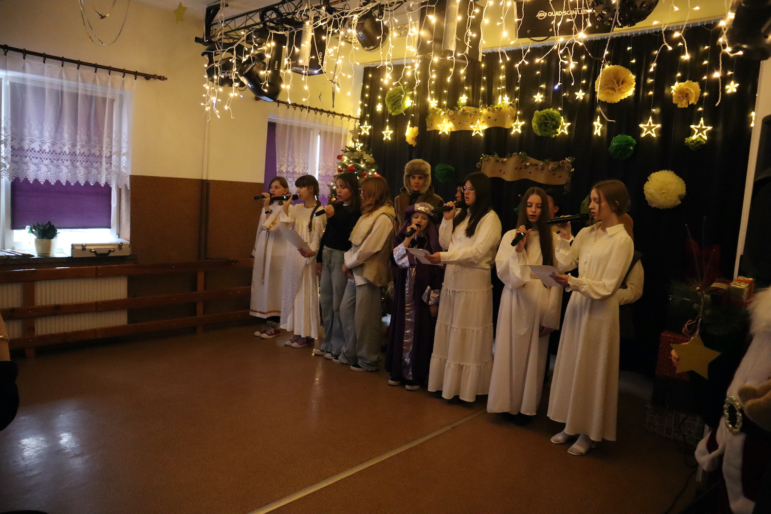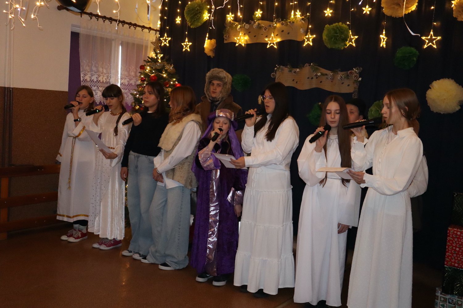 19 grudnia 2025 r. w naszej szkole panował prawdziwie świąteczny nastrój. Nie było tradycyjnych zajęć, zamiast tego uczniowie krzątali się już od rana, aby przygotować się do wigilii klasowych. Zanim jednak zasiedliśmy do wigilijnych potraw, mieliśmy okazję wysłuchać wspaniale wykonanych przez naszych uczniów kolęd i pastorałek oraz wierszy i życzeń świątecznych podczas Świątecznego Występu, przygotowanego przez p. Dariusza Tuza, p. Żanetę Szuptarską i p. Łukasza Czupryńskiego. Po występie, Pan Dyrektor podziękował młodym artystom i złożył wszystkim życzenia świąteczne po czym wszyscy podzielili się opłatkiem i udali się do swoich klas na spożycie przygotowanych potraw świątecznych.