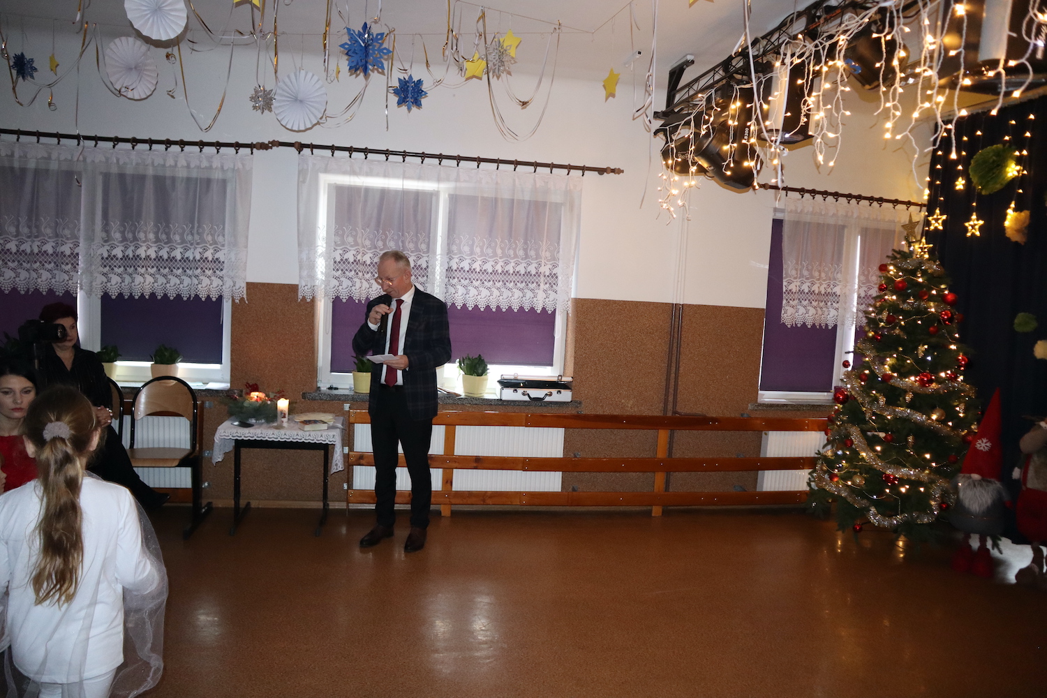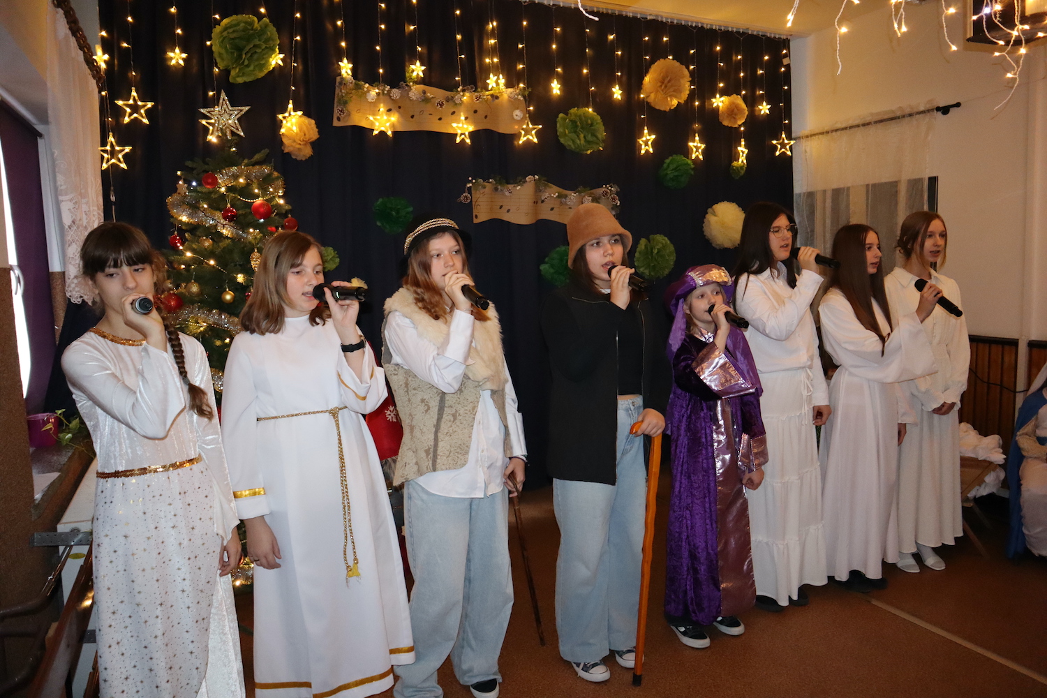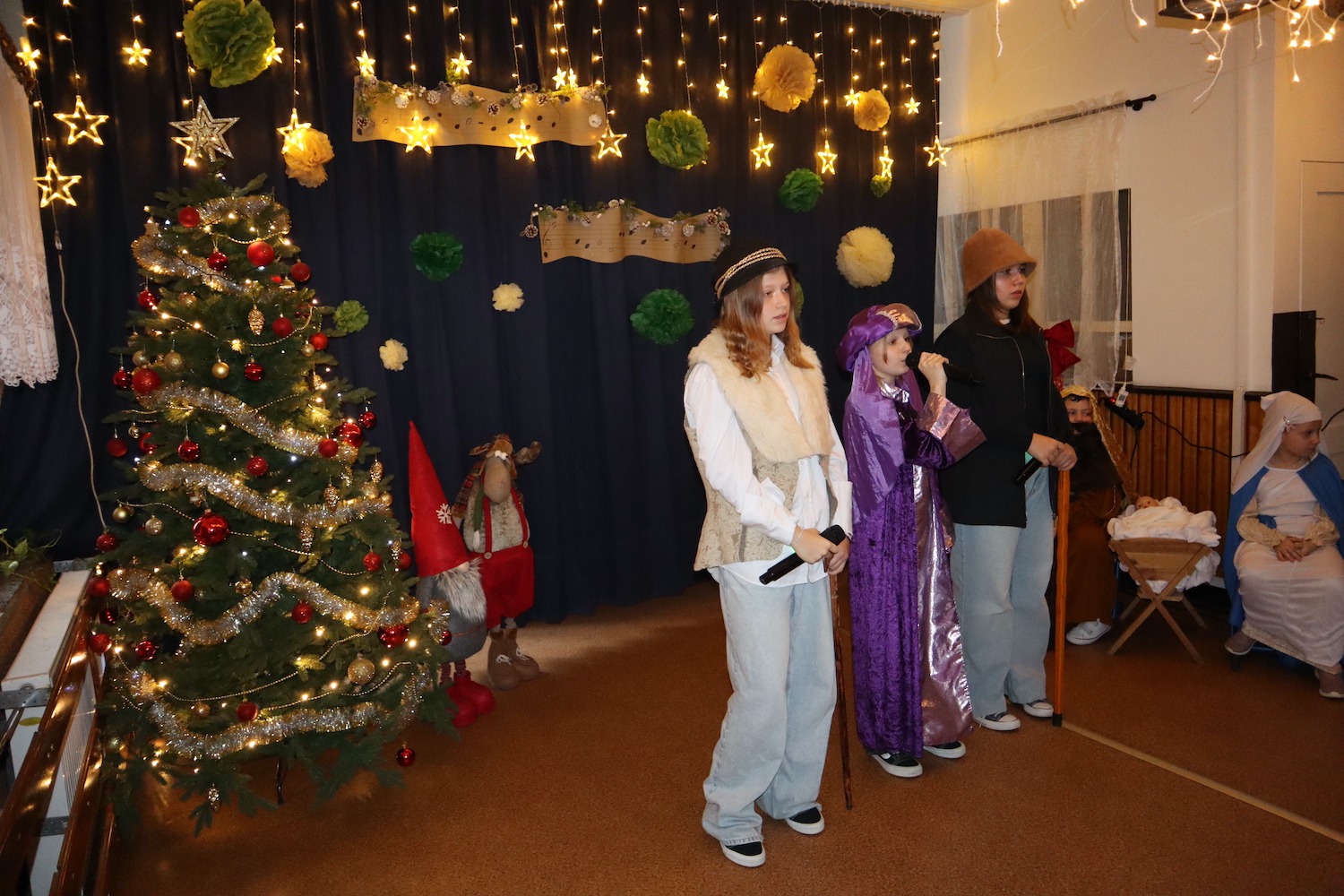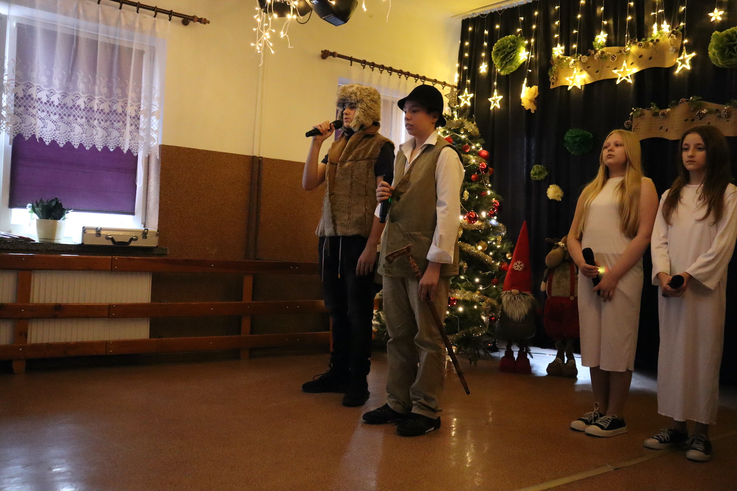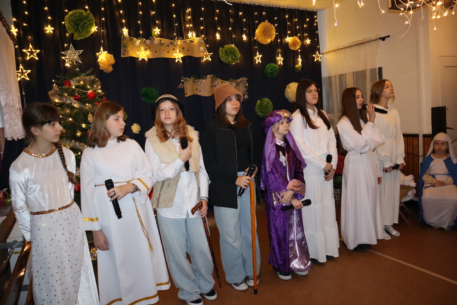 19 grudnia 2025 r. w naszej szkole panował prawdziwie świąteczny nastrój. Nie było tradycyjnych zajęć, zamiast tego uczniowie krzątali się już od rana, aby przygotować się do wigilii klasowych. Zanim jednak zasiedliśmy do wigilijnych potraw, mieliśmy okazję wysłuchać wspaniale wykonanych przez naszych uczniów kolęd i pastorałek oraz wierszy i życzeń świątecznych podczas Świątecznego Występu, przygotowanego przez p. Dariusza Tuza, p. Żanetę Szuptarską i p. Łukasza Czupryńskiego. Po występie, Pan Dyrektor podziękował młodym artystom i złożył wszystkim życzenia świąteczne po czym wszyscy podzielili się opłatkiem i udali się do swoich klas na spożycie przygotowanych potraw świątecznych.